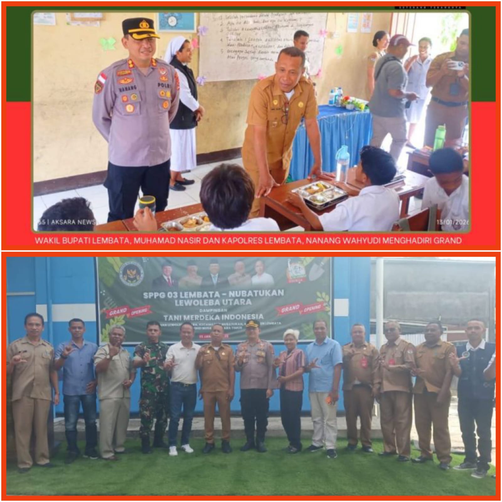 LEMBATA : WARTA-NUSANTARA.COM– Dalam upaya memperkuat ketahanan gizi dan mendukung tumbuh kembang generasi muda, Wakil Bupati Lembata, Muhamad Nasir dan Kapolres Lembata, Nanang Wahyudi menghadiri Grand Opening SPPG 03 Lembata, Kecamatan Nubatukan, Kabupaten Lembata, Provinsi NTT, 13 Januari 2026. Dengan demikian, saat ini sudah ada tiga Dapur MBG yang beroperasi yakni, Dapur MBG 01 Lamahora Penanggungjawab Hany Chandra), Dapur MBG 02 Longser Lewoleba Barat (Penanggungjawab Yohanes Viany K. Buron dan Dapur MBG 03 Nubatukan (Penanggungjawab Benediktus Lelaona). Lembata membutuhkan 27 Dapur MBG untuk melayani semua penerima manfaat anak sekolah di seluruh Lembata.