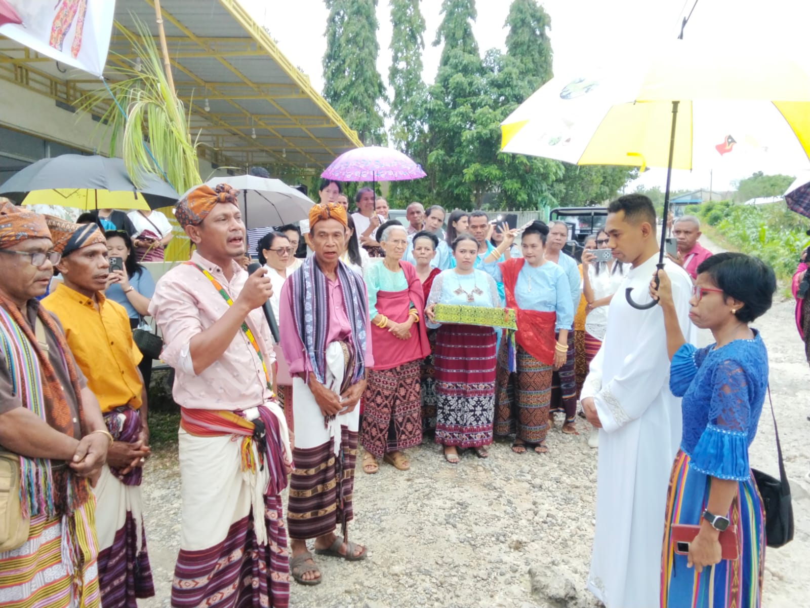 Setelah mengenakan “pakaian kebesaran” itu seorang tokoh umat menyampaikan bahwa kain yang dikenakan itu sebagai simbol “pinangan” umat untuk meminta romo segera pulang ke Paroki Noehaen.