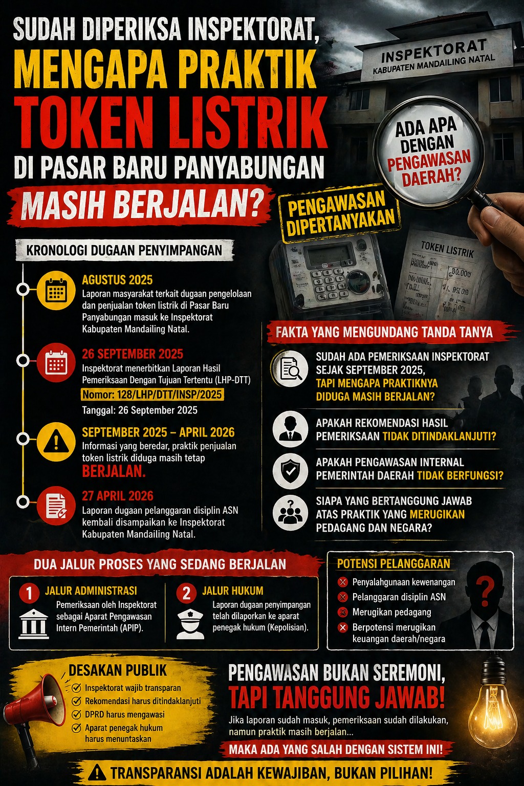MADINA : WARTA-NUSANTARA.COM– Polemik dugaan praktik penjualan token listrik di lingkungan Pasar Baru Panyabungan kini memunculkan pertanyaan serius terhadap efektivitas pengawasan internal pemerintah daerah.