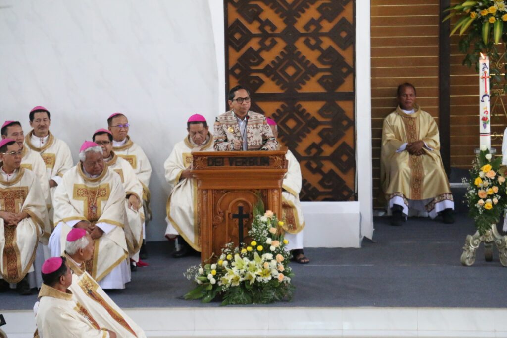 Penjabat Gubernur NTT, Ayodhia G. L. Kalake, SH, MDC dalam sambutannya mengungkapkan apresiasi dan selamat kepada Uskup Agung Kupang Mrg. Hironimus Pakaenoni.