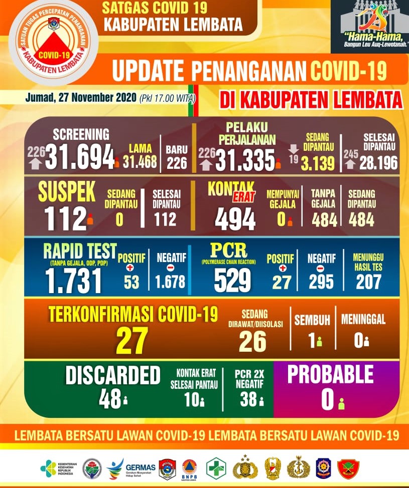 LEMBATA : WARTA-NUSANTARA.COM– Perkembangan kasus konfirmasi positif Covid-19 di Kabupaten Lembata masih tercatat sebanyak 27 kasus . Namun, hingga saat ini 207 sampel Swab yang dikirim masih dalani pemeriksaan di laboratorium RSUD Prof. Dr. W Z Johannes-Kupang.