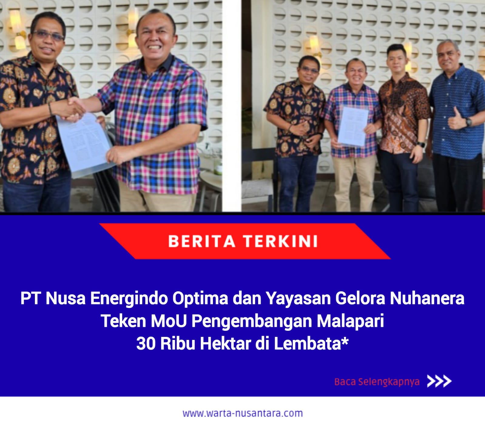 JAKARTA : WARTA-NUSANTARA.COM— PT Nusa Energindo Optima (PT NEO) dan Yayasan Gelora Nuhanera (YGN) secara resmi menandatangani nota kesepahaman (Memorandum of Understanding/MoU) pada Jumat, 27 Februari 2026, untuk mendorong pengembangan penanaman Malapari di lahan kritis seluas 30 ribu hektar di Kabupaten Lembata, Nusa Tenggara Timur.